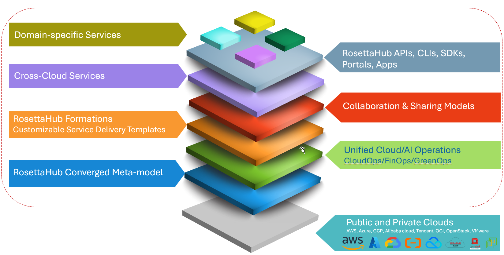 RosettaHub is a Supercloud platform -- a SaaS abstraction layer that sits above multiple public and private cloud providers, unifying them under a single platform. Rather than managing each cloud independently -- learning separate consoles, APIs, billing models, and security paradigms -- RosettaHub lets organizations treat AWS, Azure, GCP, Alibaba Cloud, OVH, and OpenStack as one cohesive environment.