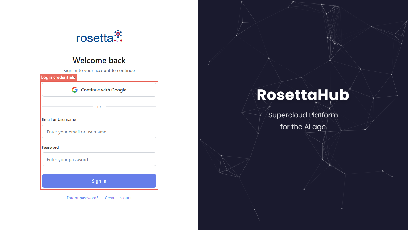 Navigate to https://www.rosettahub.com/console-v2/Login and enter your credentials.