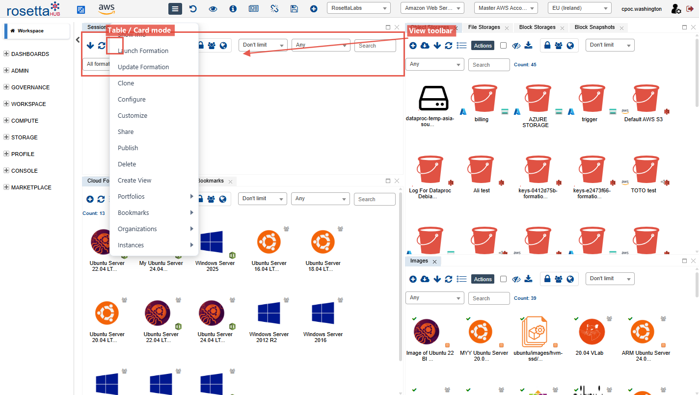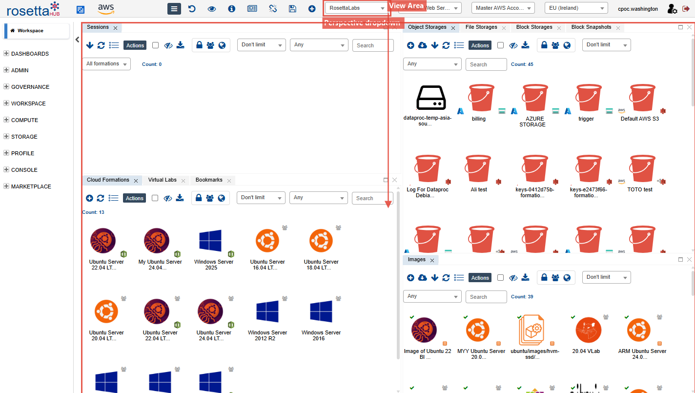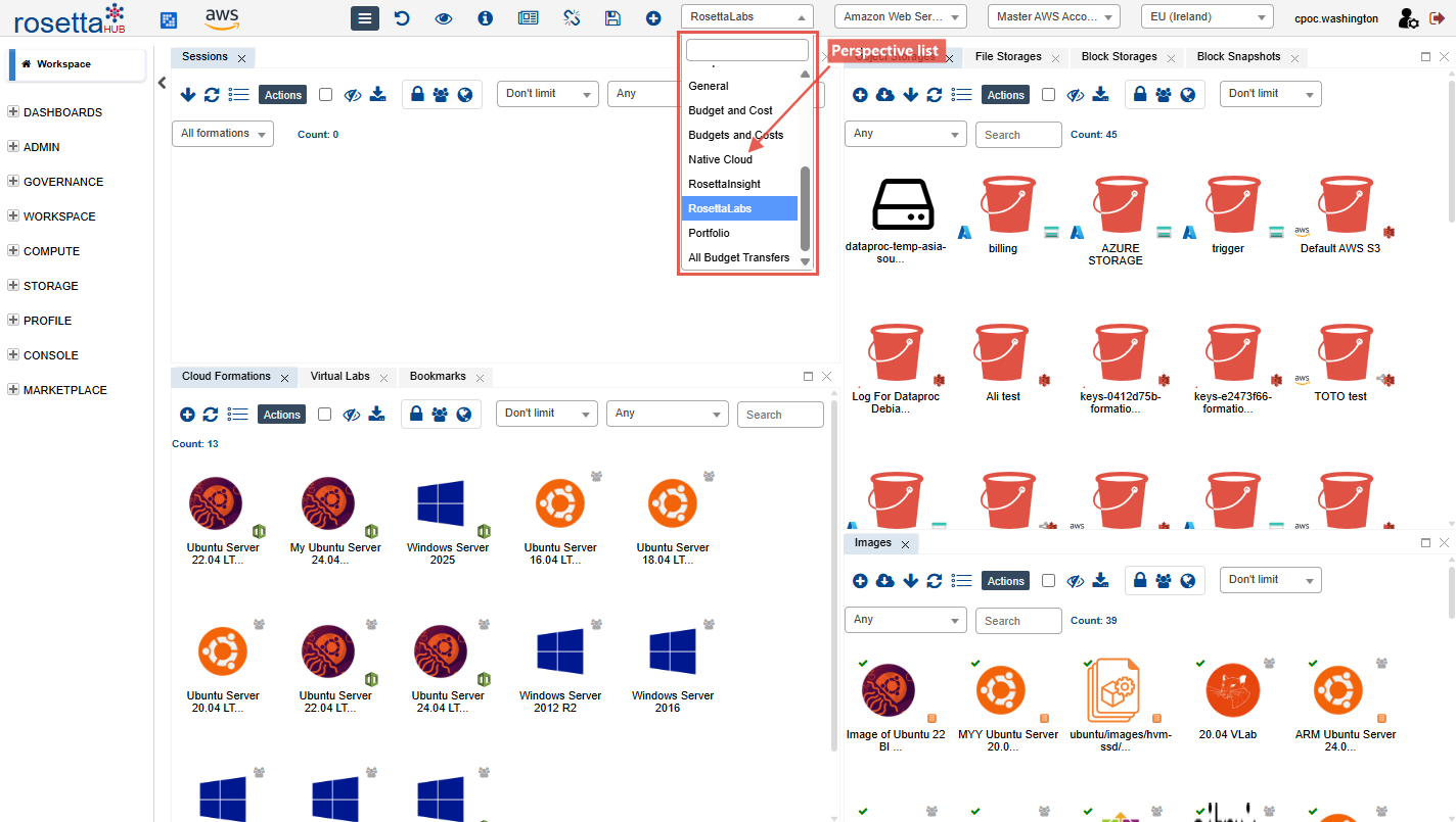 RosettaHub ships with public perspectives for every major workflow. Your organization may share additional perspectives -- including FinOps dashboards, resource analytics, and custom workspaces.