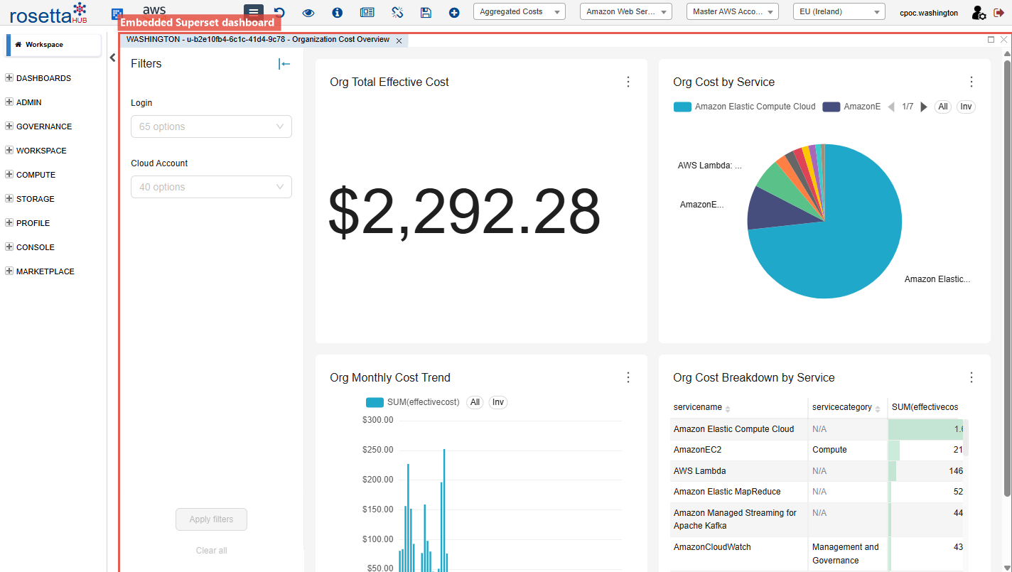 These dashboards pull data from RosettaHub's cost and resource aggregation engine. Filters for cloud provider, account, and region in the toolbar apply globally to all views in the perspective.